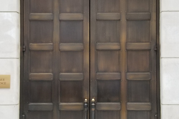 The building features seven pairs of custom offset pivoted swing doors. Made with #280 Muntz bronze, the doors feature a satin #4 finish and were statuary finished in the field to achieve a darker tone.